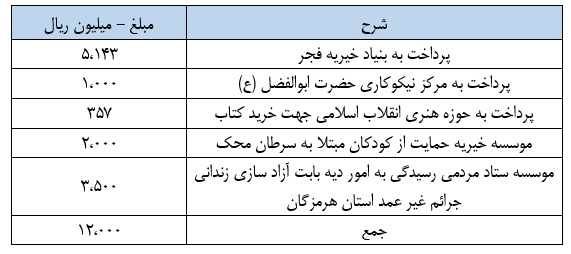 • انجام اقداماتی در راستای ایفای مسئولیت های اجتماعی از محل بودجه تخصیص داده شده در مجمع عمومی عادی سالیانه مورخ 1403/10/29 به مبلغ 12،000 میلیون ریال که به شرح جدول زیر مورد استفاده قرار گرفته است: